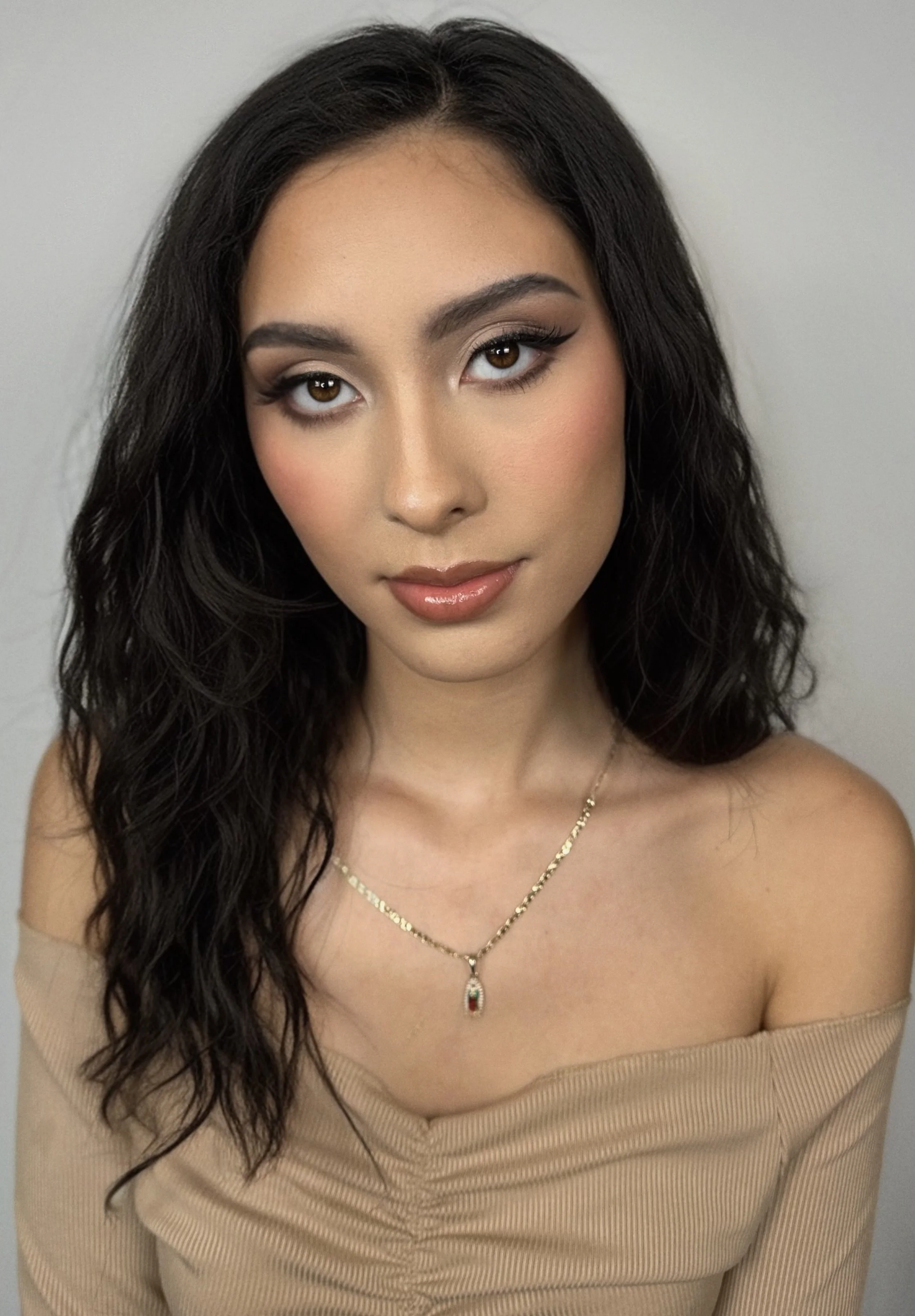 A woman with dark curly hair, makeup, and a nude-colored off-the-shoulder top wearing a gold necklace with a pendant, looking directly at the camera.