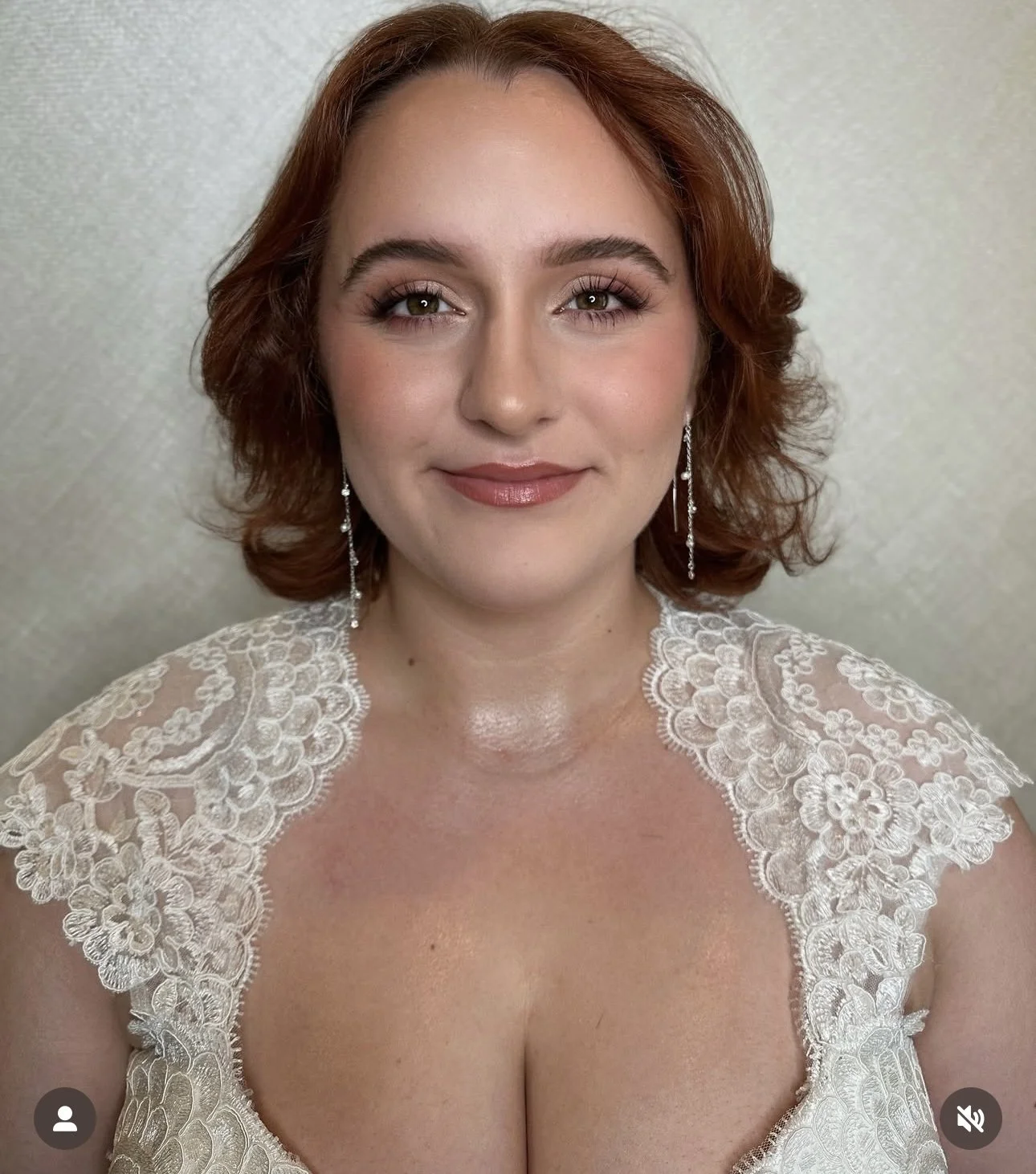 A woman with shoulder-length curly red hair, wearing makeup and a white lace dress with floral embroidery, is smiling at the camera against a plain background.