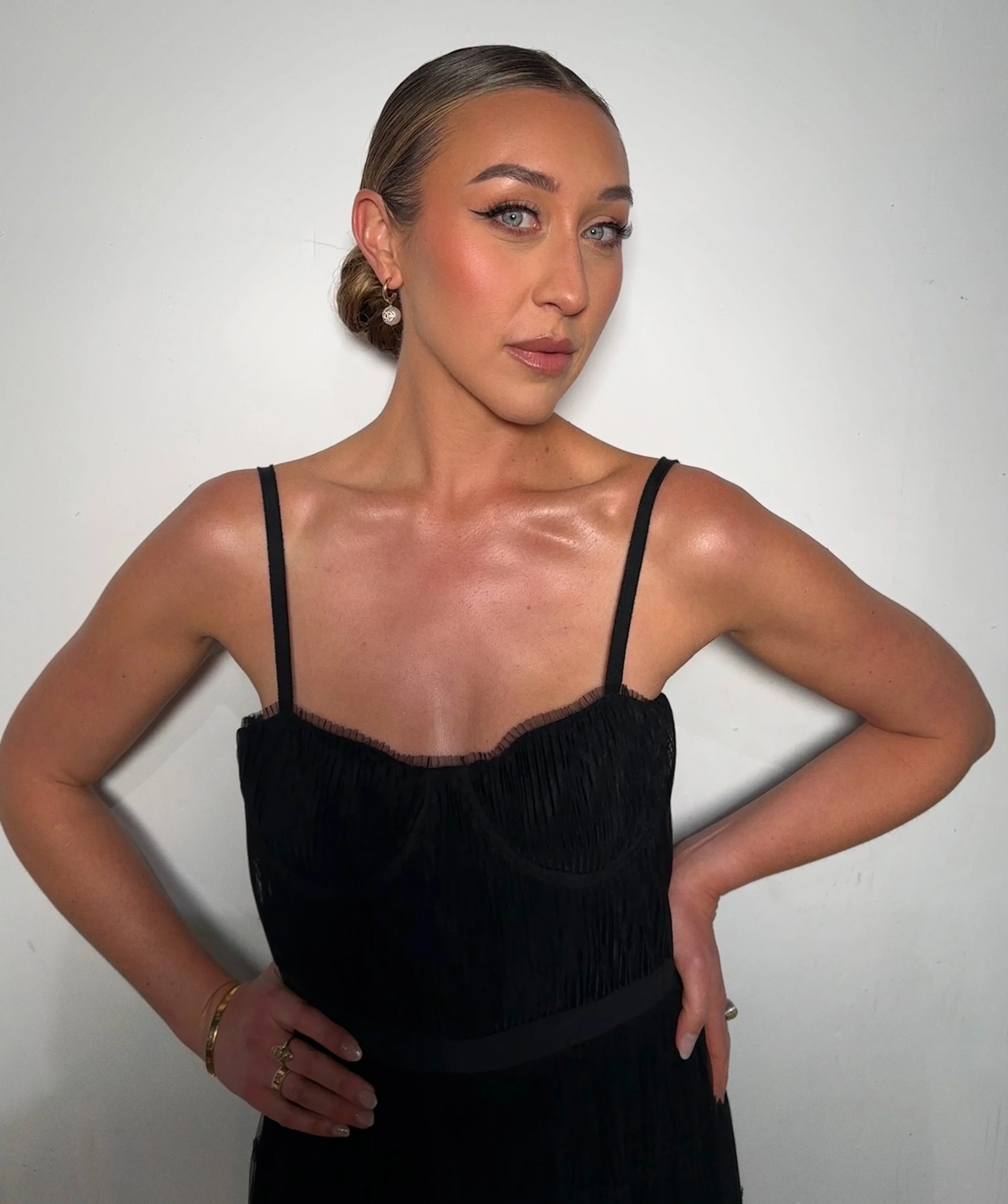 A woman with blonde hair in a low bun, wearing makeup including eyeliner, eyeshadow, and lipstick, standing against a plain white wall. She is dressed in a black spaghetti strap dress, with her hands on her hips, looking at the camera.