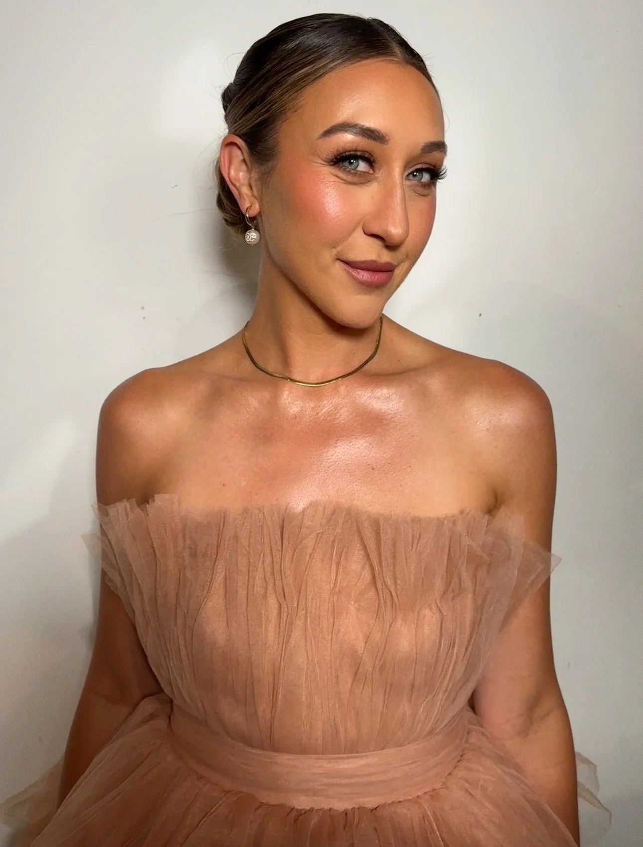 A young woman with blue eyes and light brown hair styled in an elegant updo, wearing a strapless peach-colored dress with a pleated bodice, a thin gold choker necklace, and small silver earrings, posing against a plain white wall.