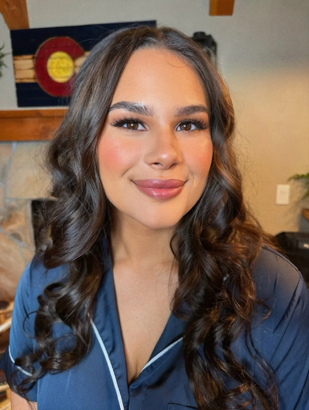 Close-up of a smiling woman with long, curly brown hair, wearing a dark blue shirt, indoors with a fireplace and Colorado-themed decor in the background.
