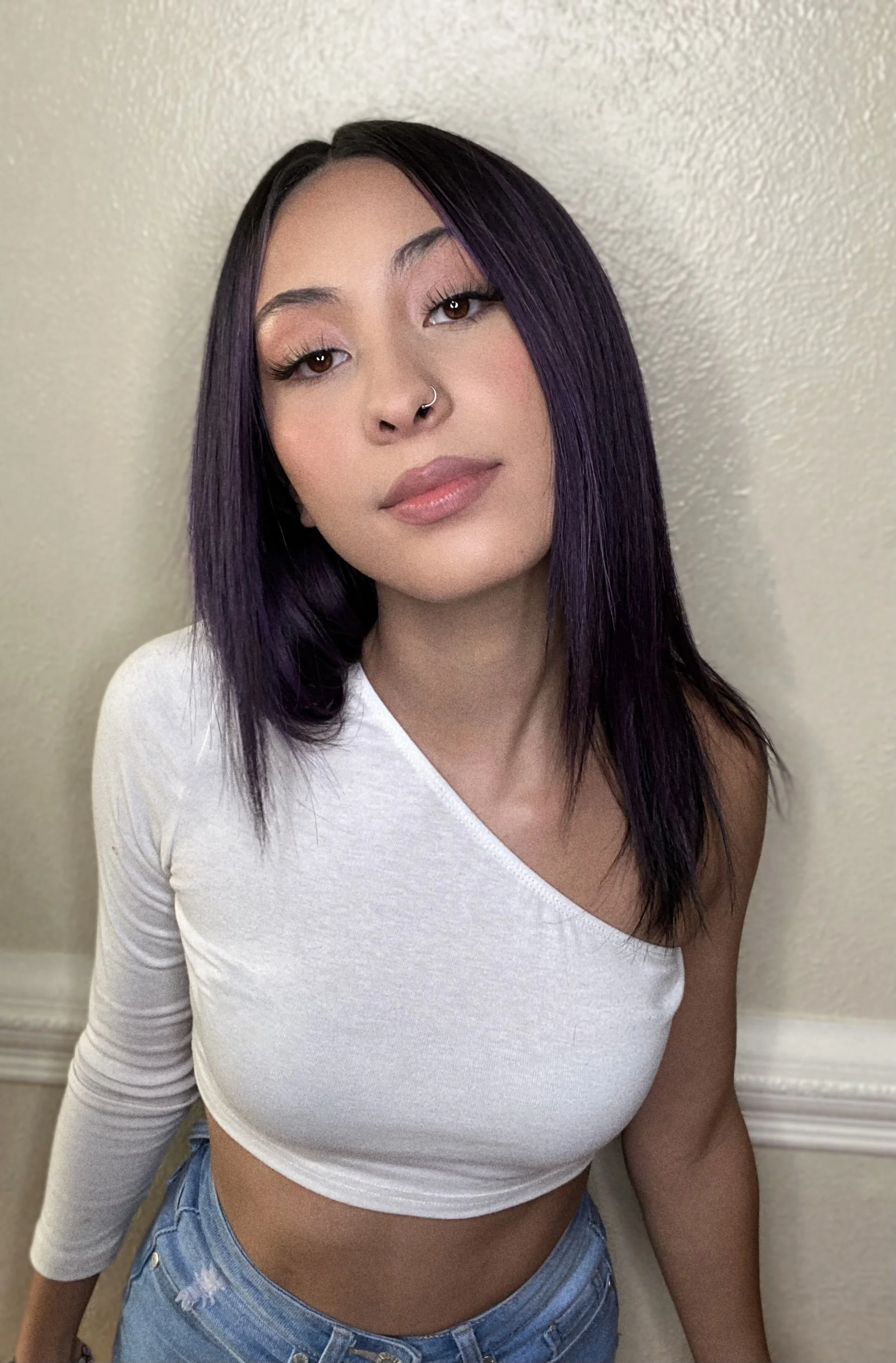Young woman with purple hair, nose piercing, wearing a white off-shoulder crop top and jeans, standing against a beige wall.