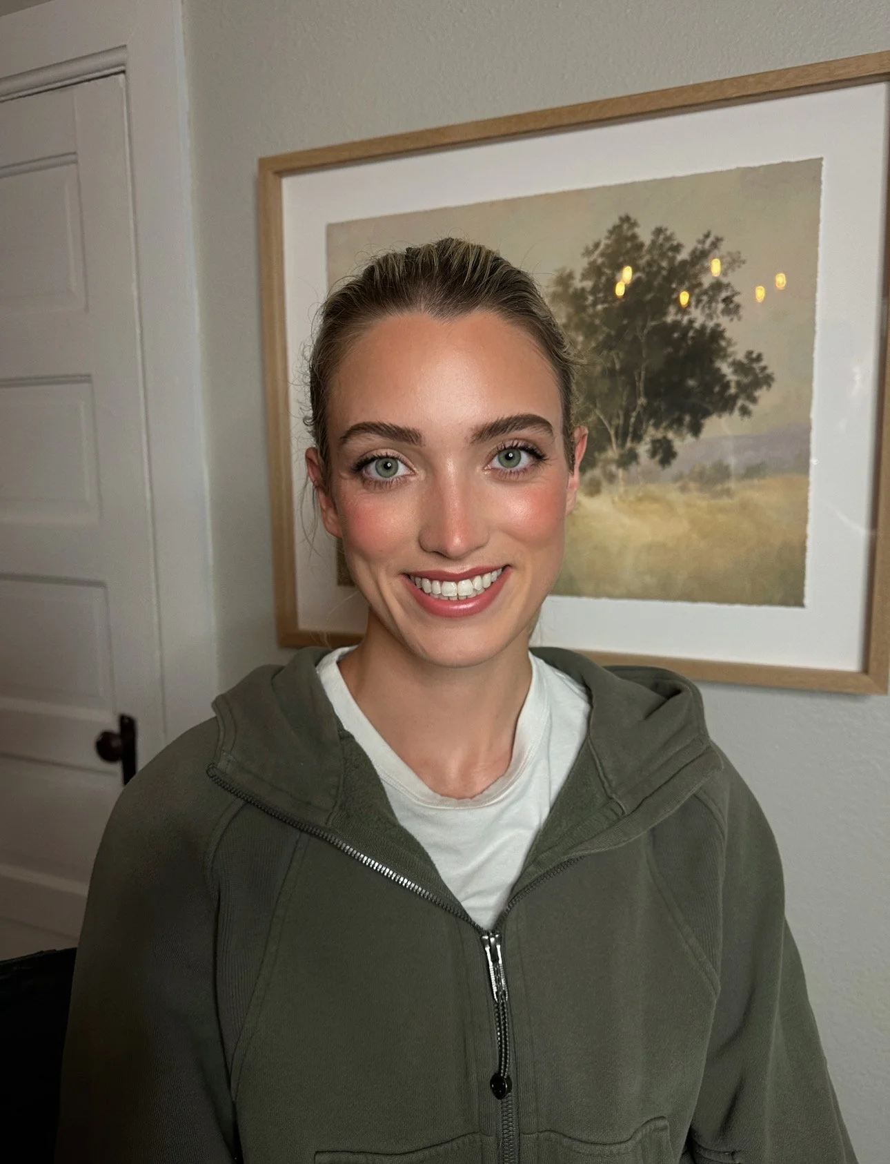 A young woman with blonde hair and green eyes smiling, wearing a green zip-up hoodie over a white t-shirt, standing indoors in front of a framed landscape painting of a tree and grassy field.
