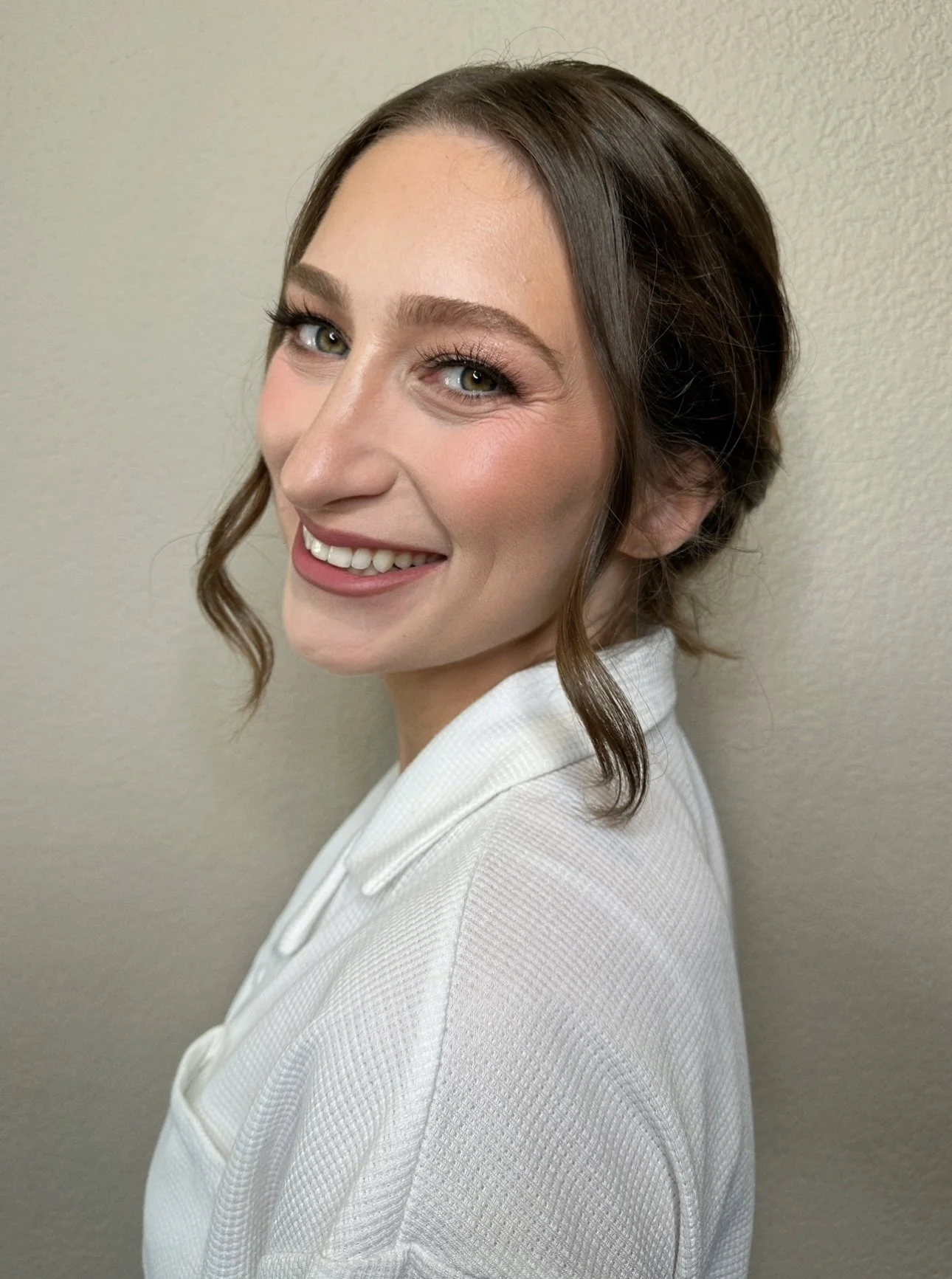 A young woman with blue eyes and brown hair styled in an updo, wearing a white button-up shirt and a gold necklace, sitting in a room with a mirror and framed pictures in the background.