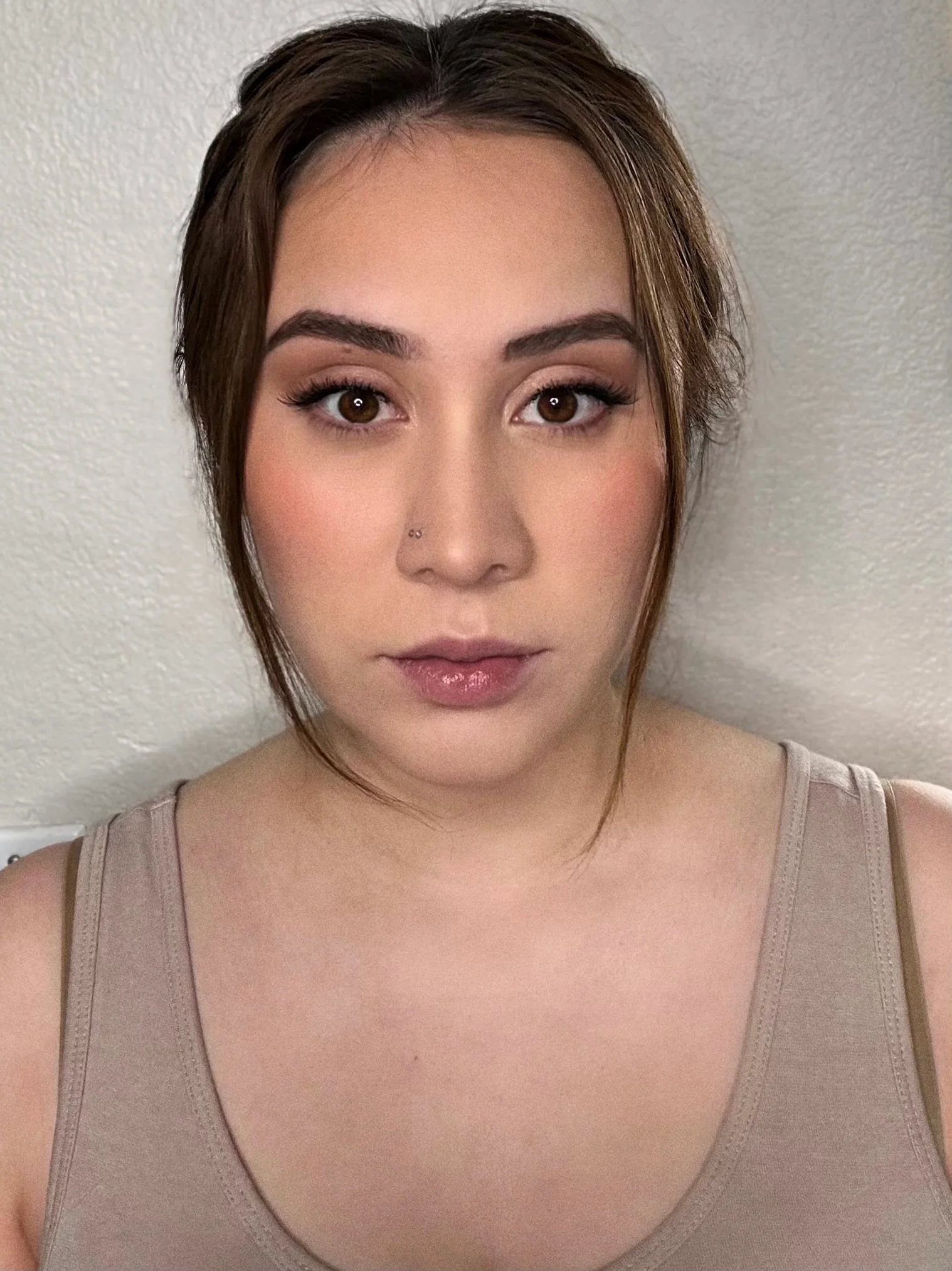 A young woman with brown hair and brown eyes looking directly at the camera, wearing a beige tank top, with a neutral wall in the background.